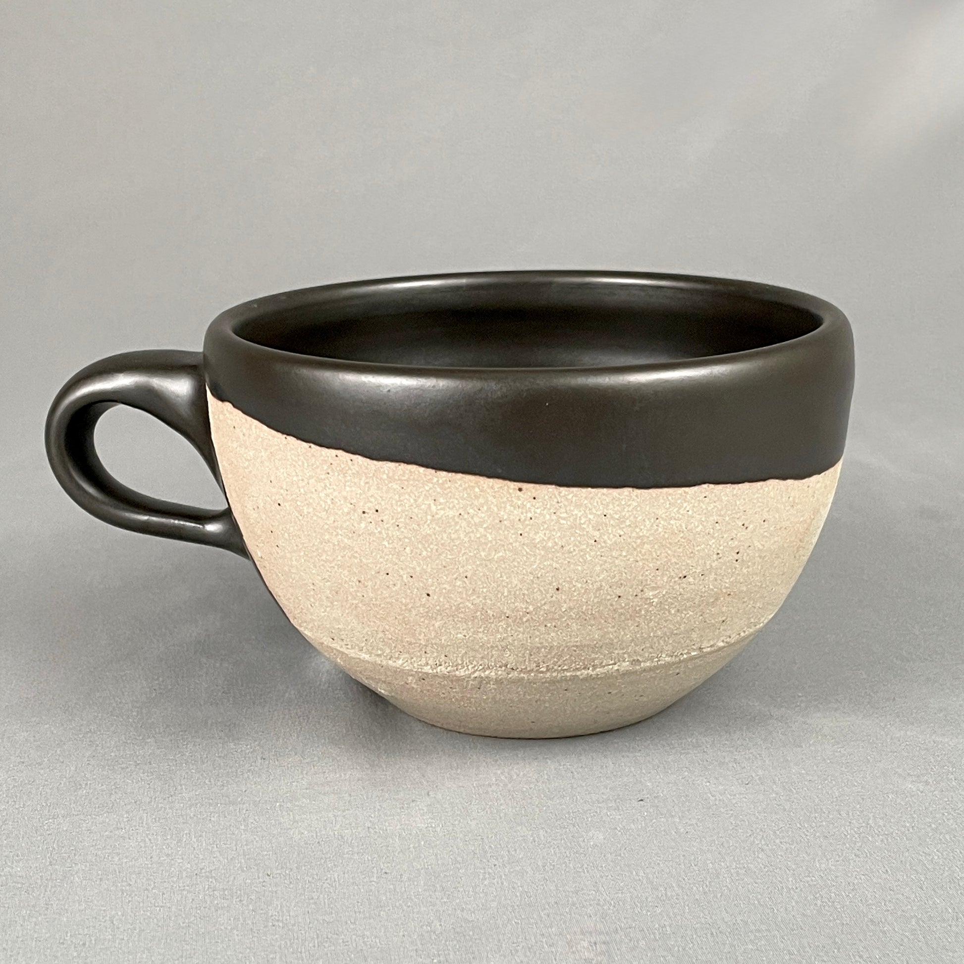 Black satin interior glaze. Exterior black satin geometric designs. Unglazed areas vary from soft white to warm sand color. Stoneware clay. Food safe. Microwave safe. Dishwasher safe although handwashing is recommended. Created by John Foelber. JF stamp on bottom. This one is the largest of the series. Holds 20oz. 4"h x 5.5"w.