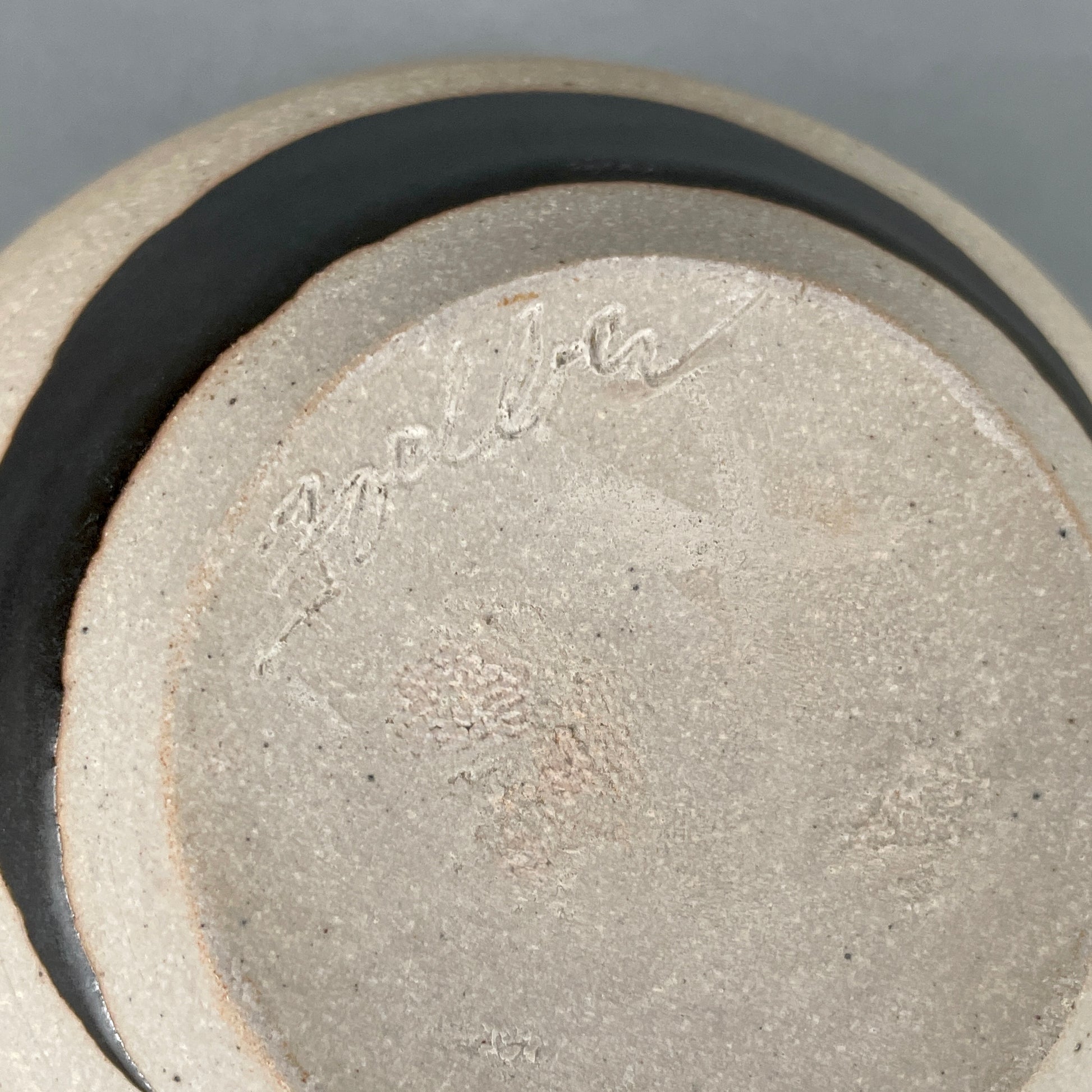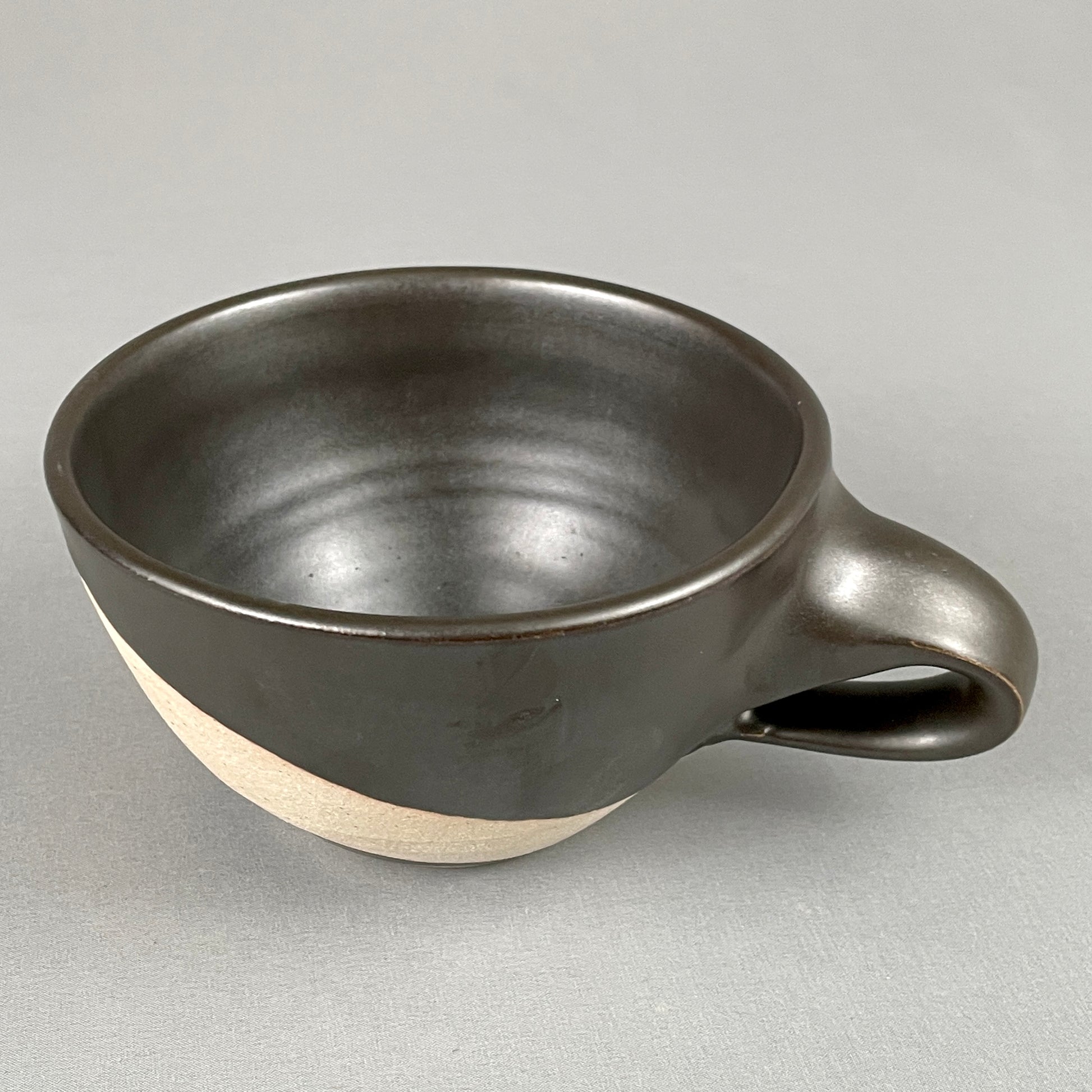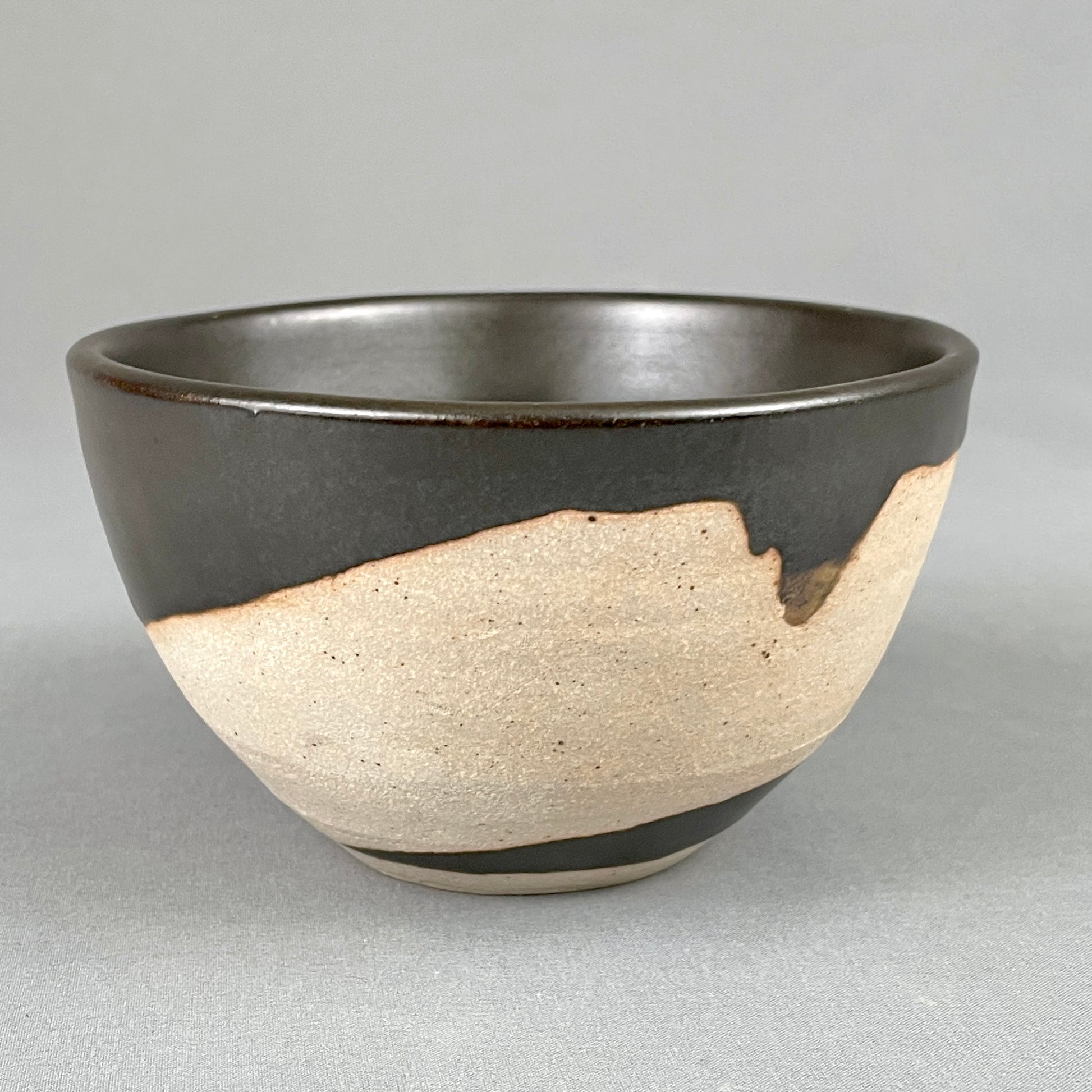 Black satin interior glaze. Exterior has unique black satin geometric designs. Unglazed areas vary from soft white to warm sand color. Stoneware clay. Food safe. Microwave safe. Dishwasher safe although handwashing is recommended. Created by John Foelber. "Foelber" signature on bottom. Holds 16oz. 3"h x 5"w.