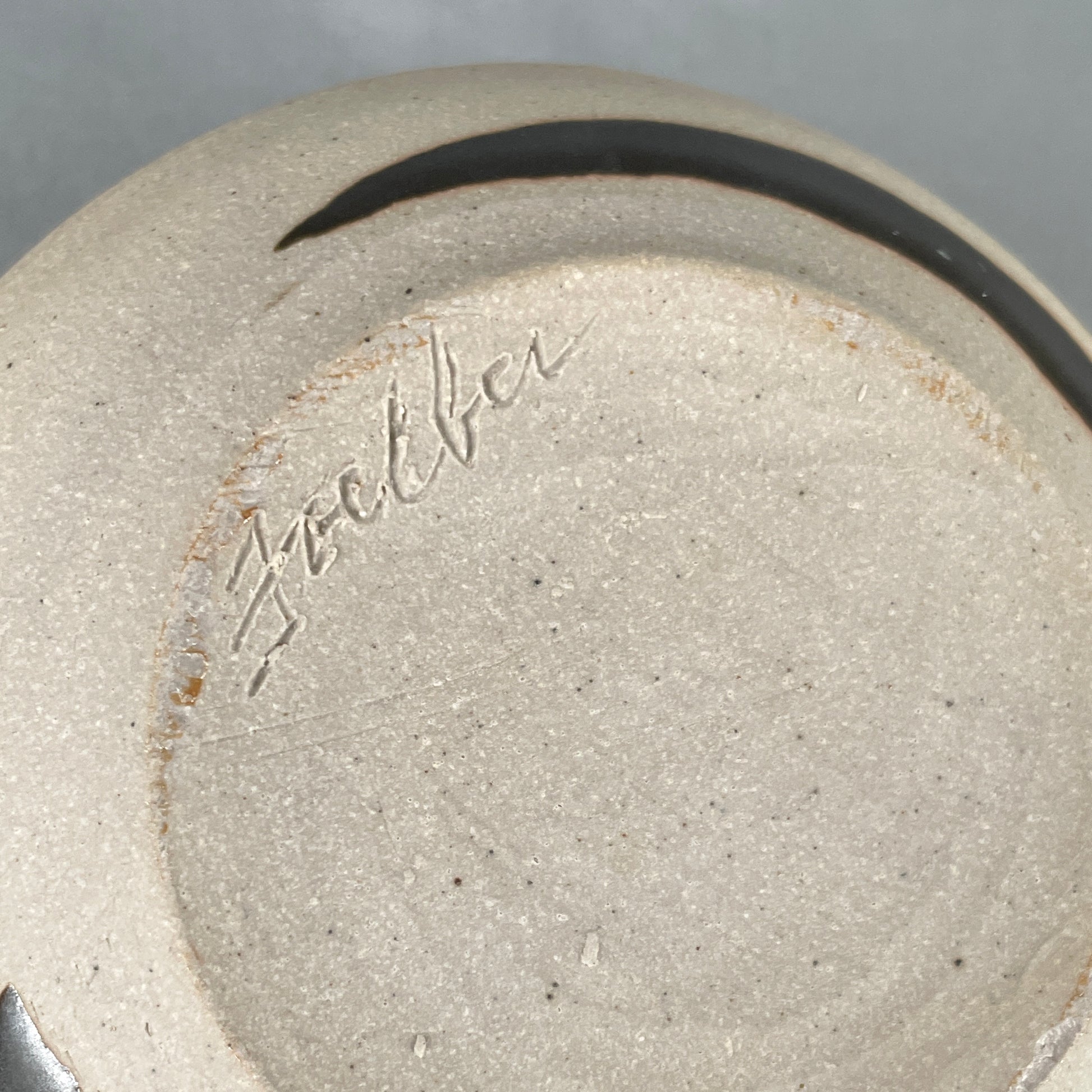 Black satin interior glaze. Exterior has unique black satin geometric designs. Unglazed areas vary from soft white to warm sand color. Stoneware clay. Food safe. Microwave safe. Dishwasher safe although handwashing is recommended. Created by John Foelber. "Foelber" signature on bottom. Holds 16oz. 3"h x 5"w.