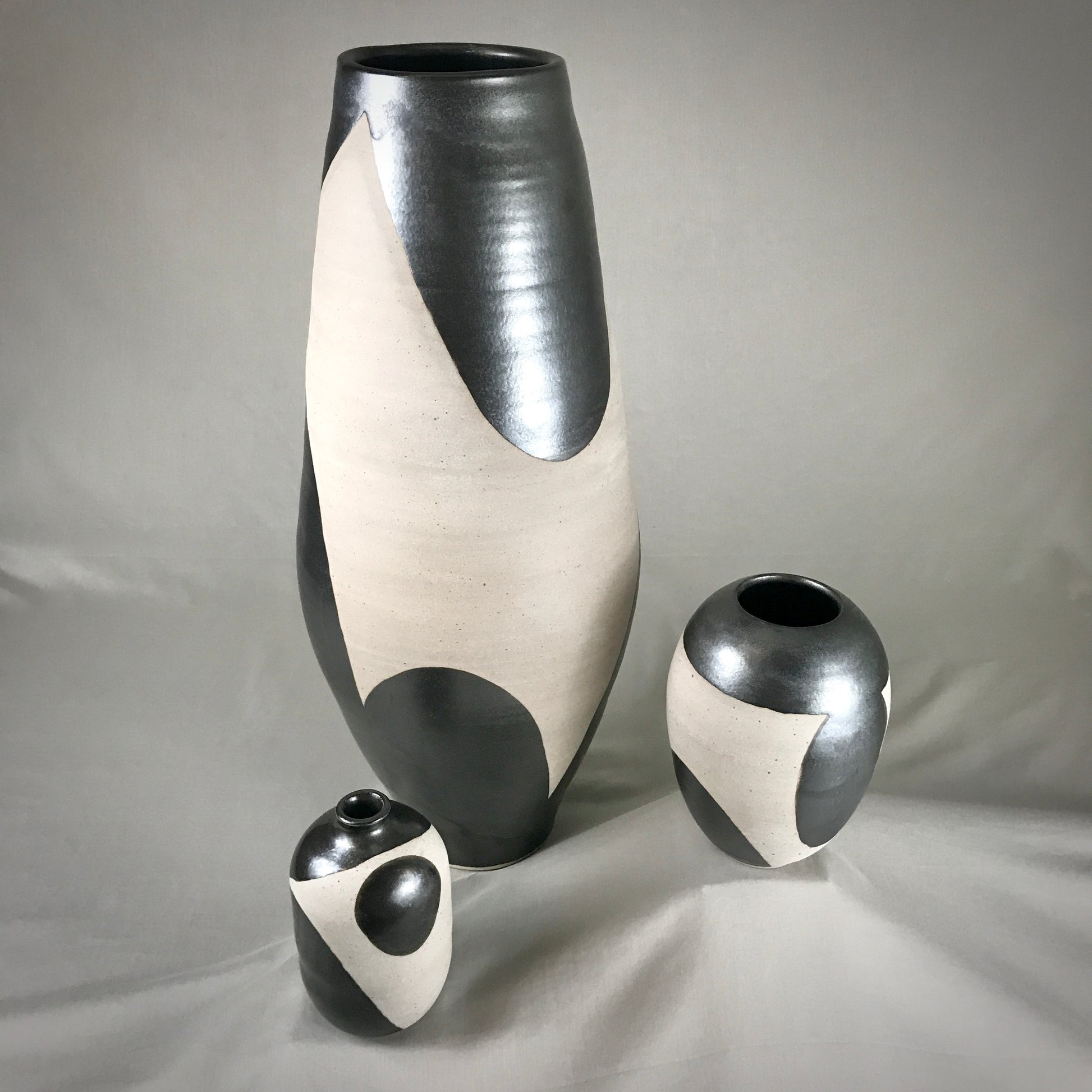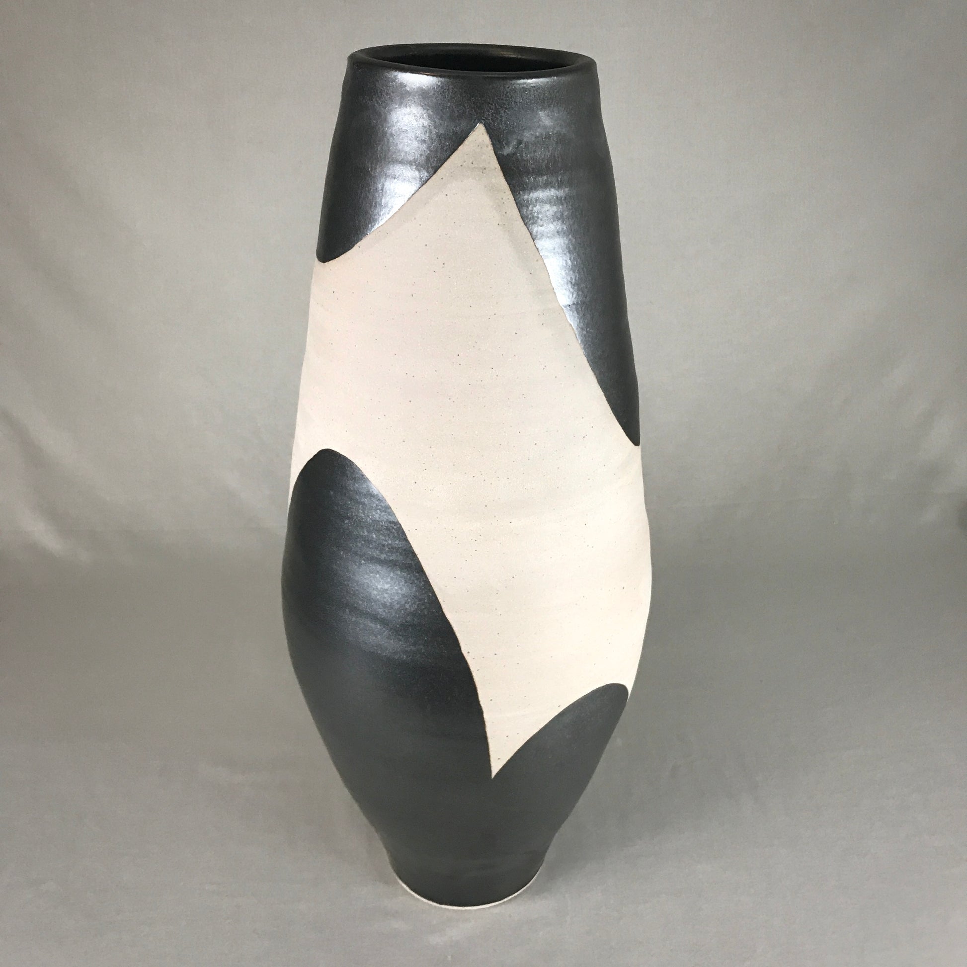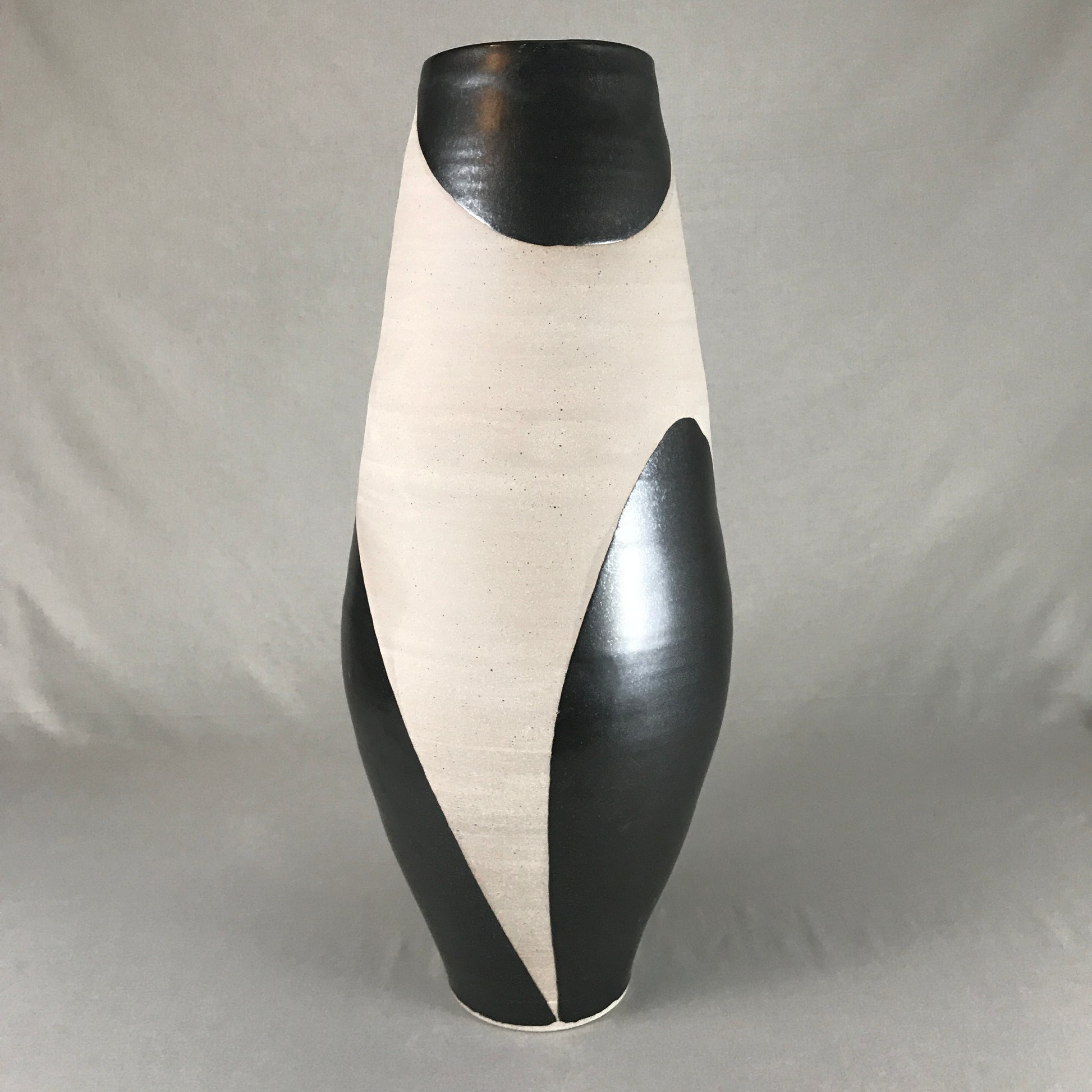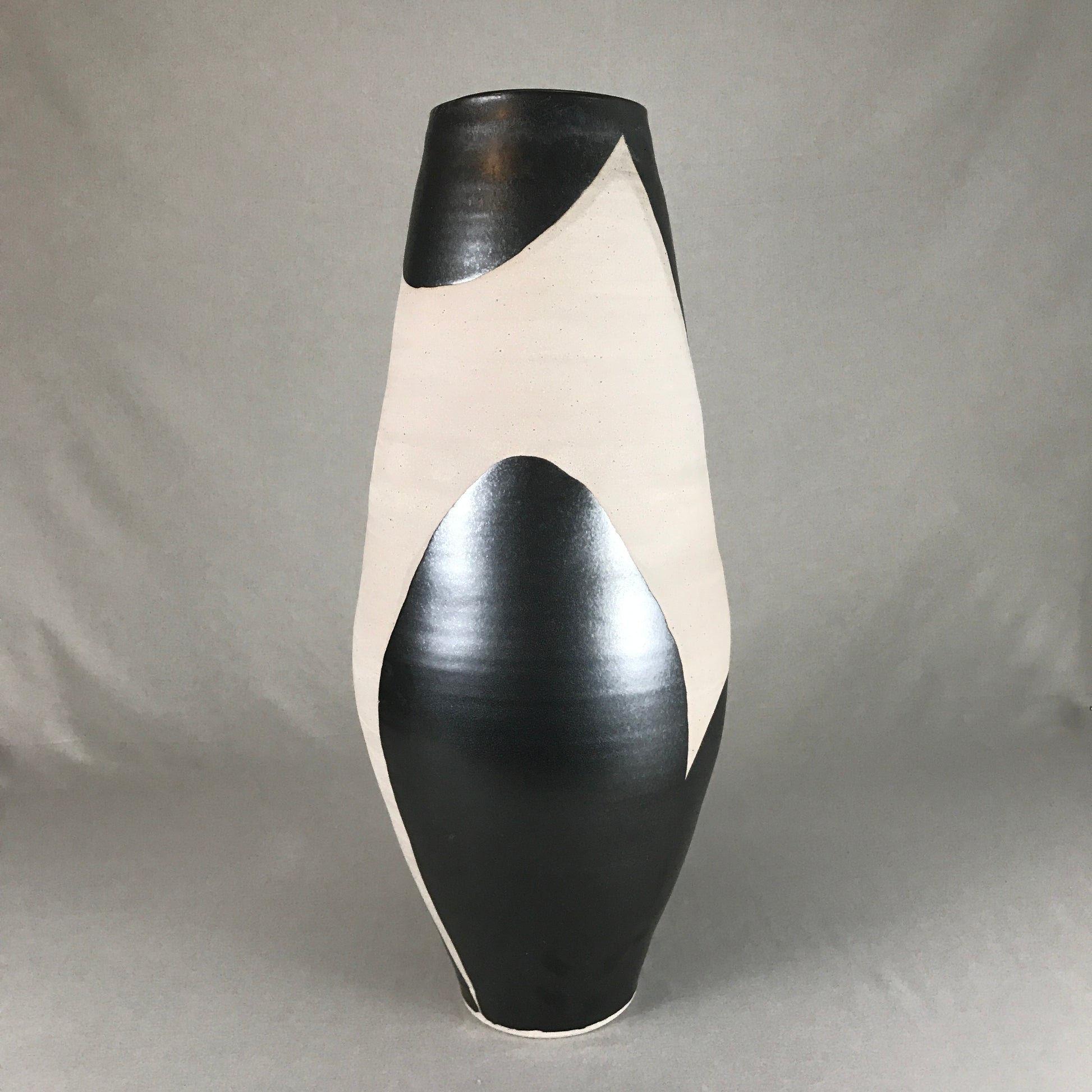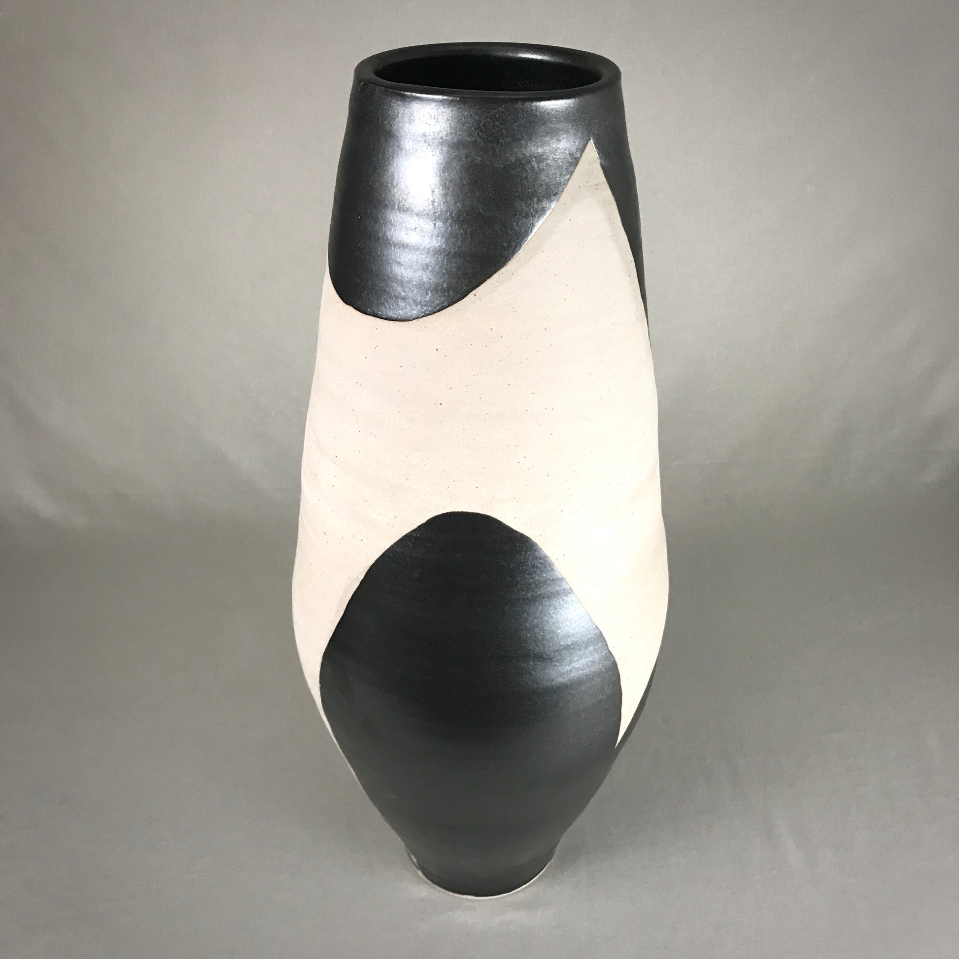 22" tall vase of white stoneware clay. Interior black satin glaze. Exterior black satin patterns with raw clay areas. Water tight.