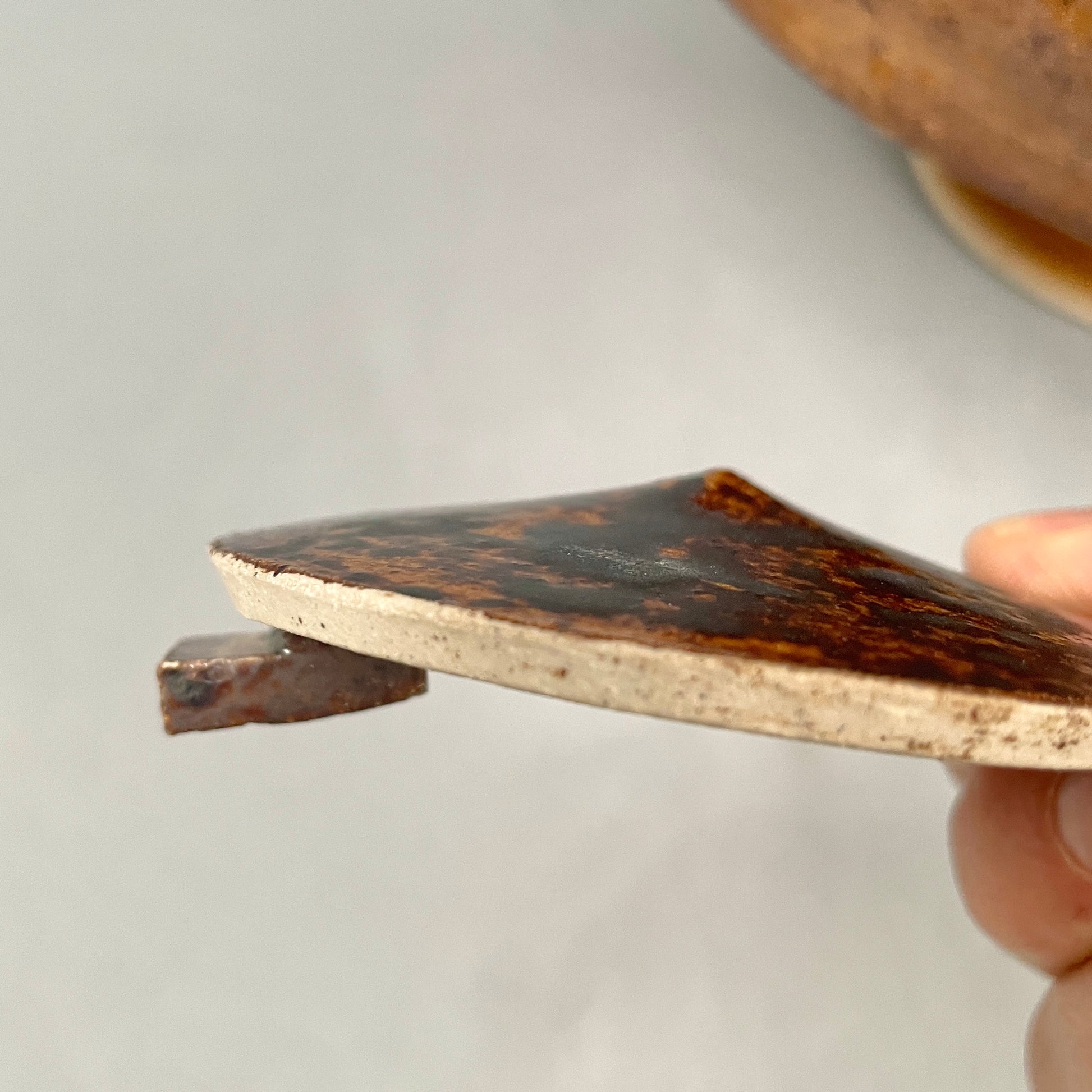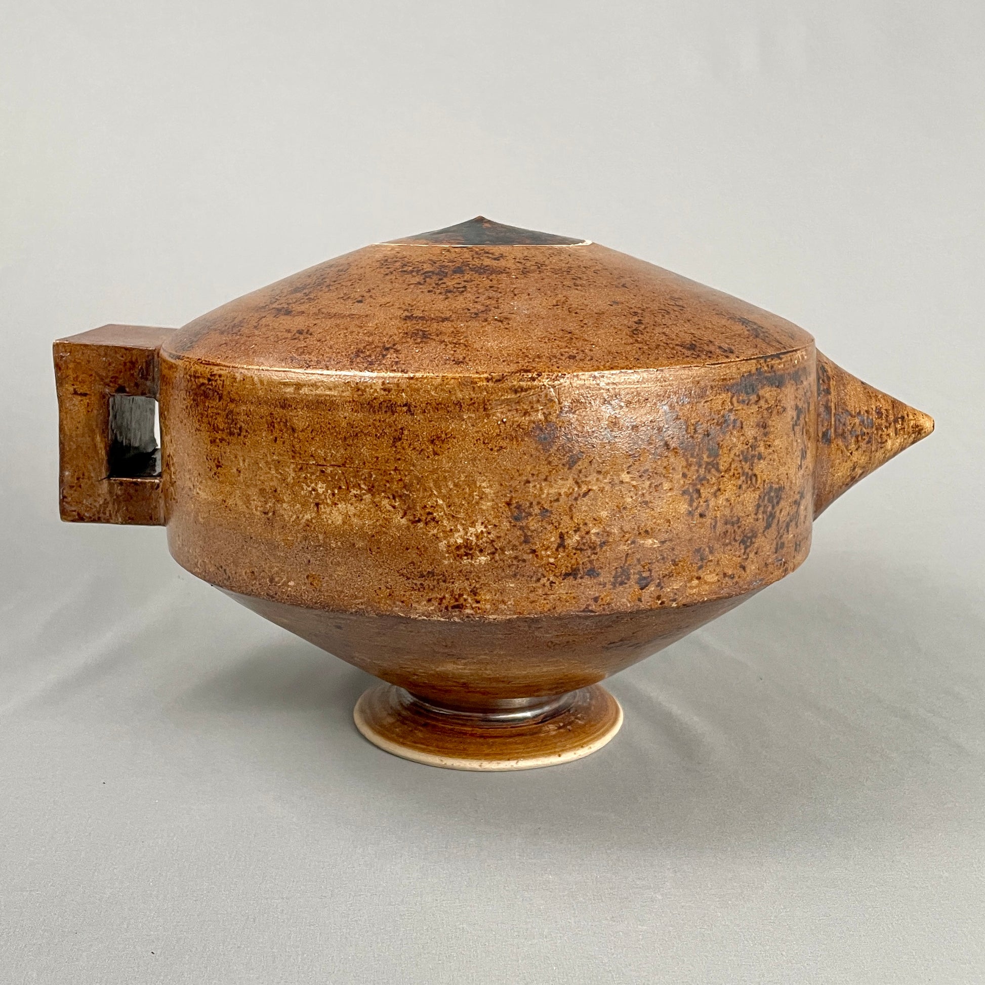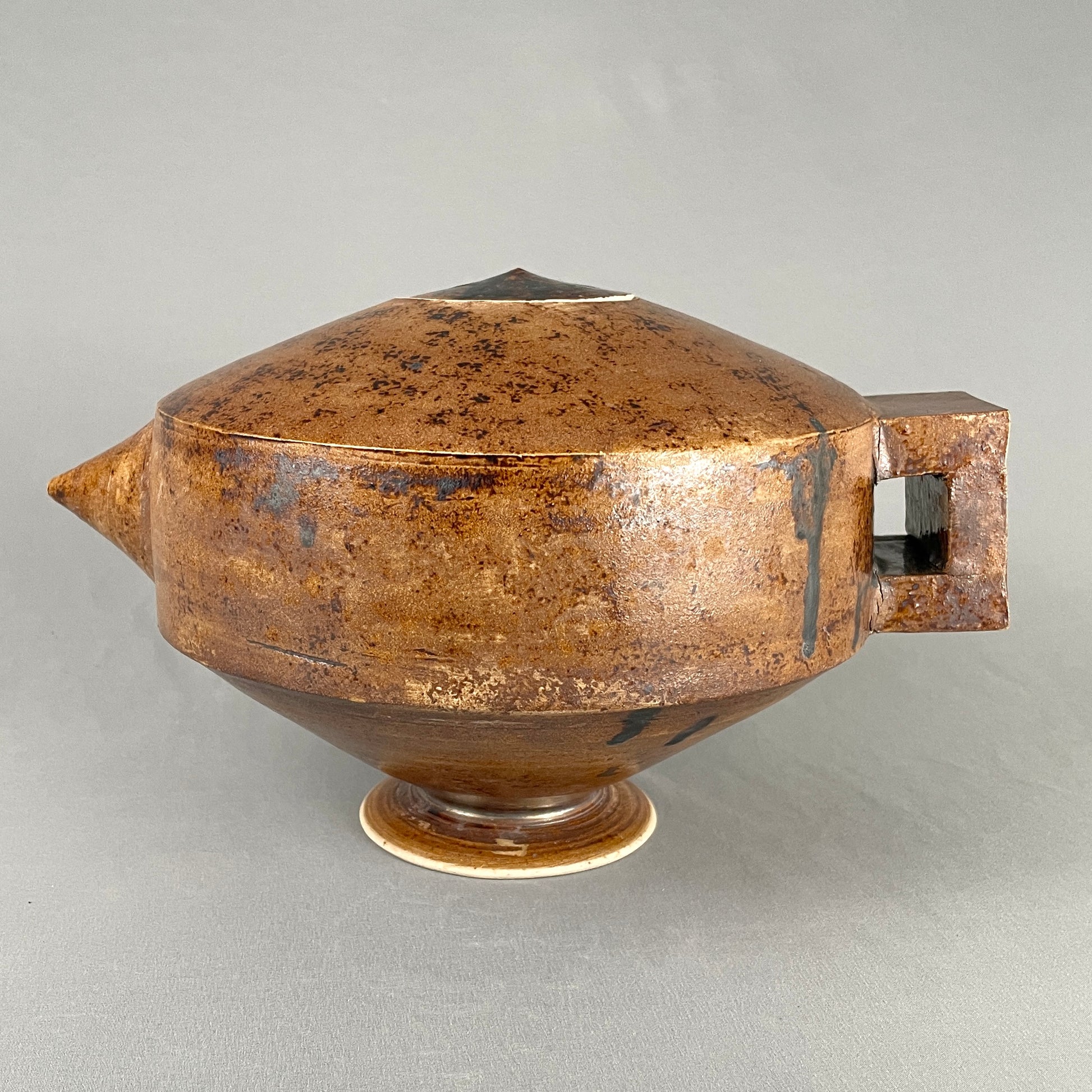 Stoneware teapot in bronze-like glaze. Fabulous proportions include a wide, angular body; chunky, blocky handle; cone shaped spout with extremely small opening; pointed lid with secret notch to hold in place; and graceful, small pedestal foot. A true sculptural statement piece. Not meant for serving tea.