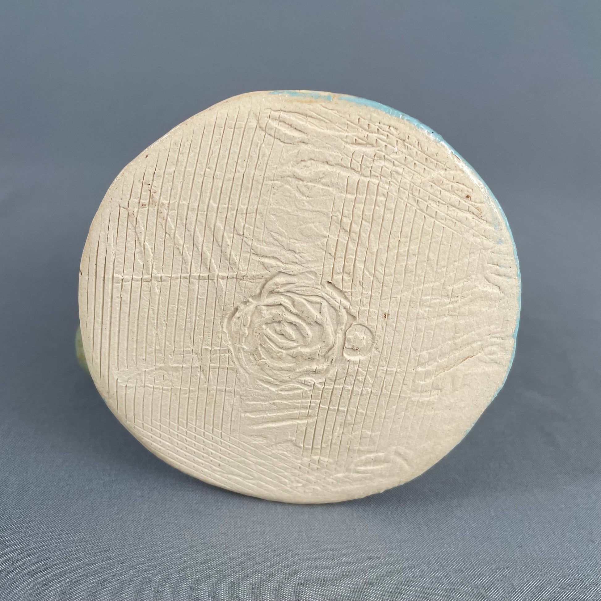 Delightful, stoneware, handbuilt mug with abstracted floral pattern. Outer motif is created using a paper transfer technique similar to printmaking. Subtle textures add more surface dimensions. Makers mark on the bottom.