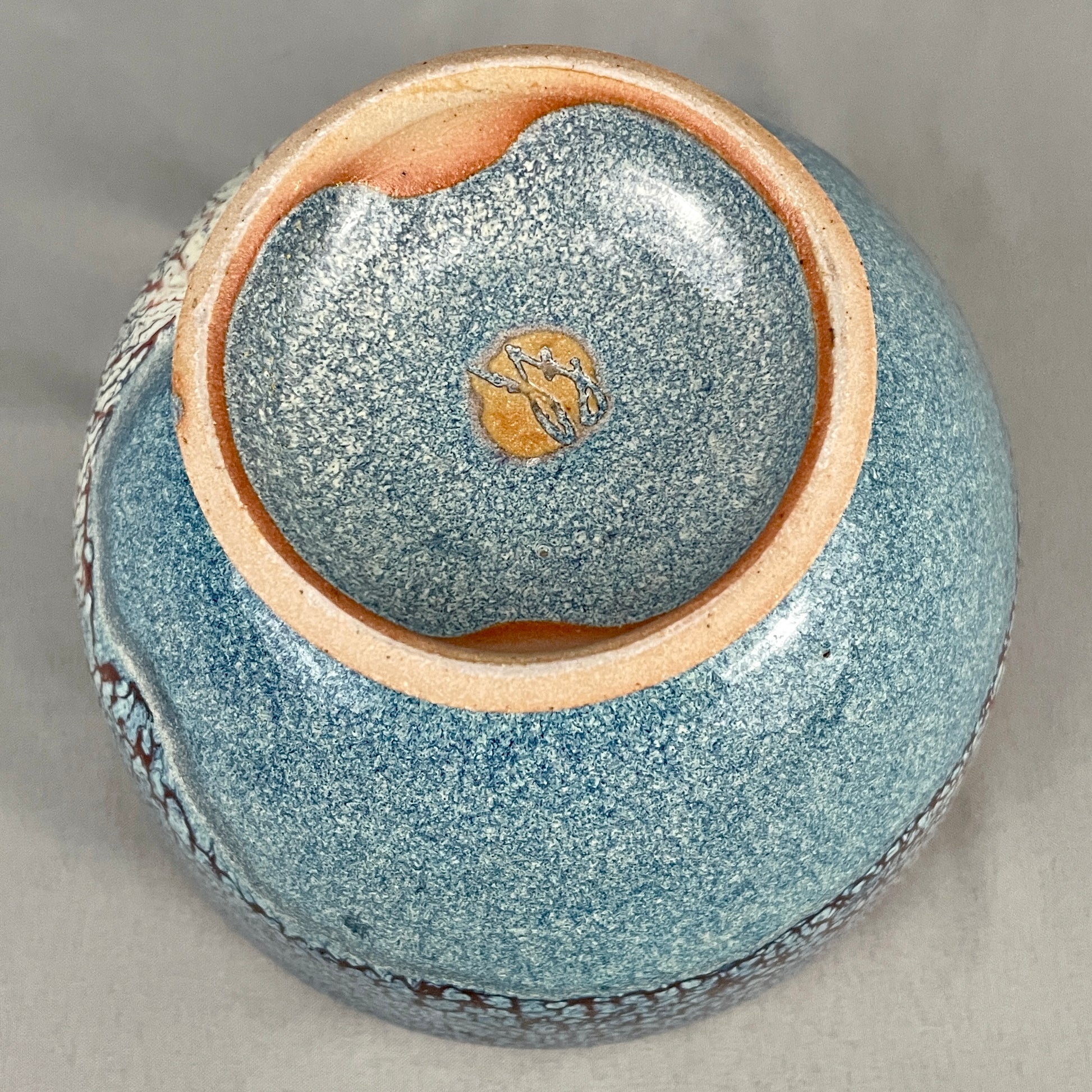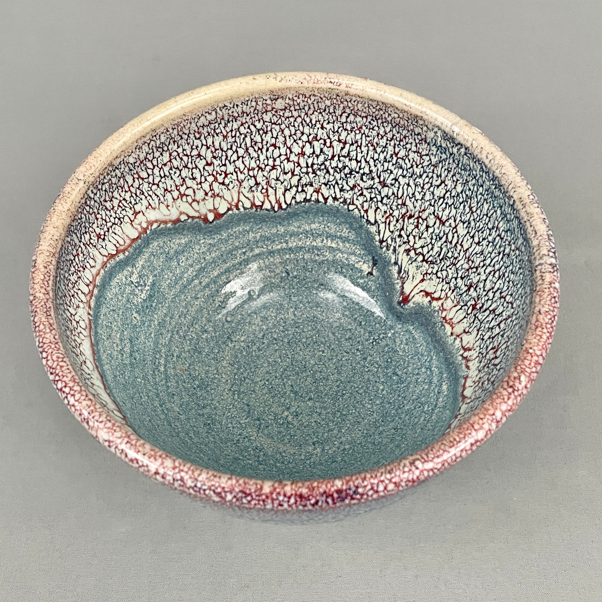 Dappled colors of reds, blues, and cream. This glaze combination is uniquely different and beautiful every kiln firing. The bowl design is fabulously functional. Extra elegance with the small pedestal foot. Food safe. Microwave safe. Dishwasher safe (although handwashing will extend the life). Handmade by John Foelber. Signed on bottom with his makers mark JF.