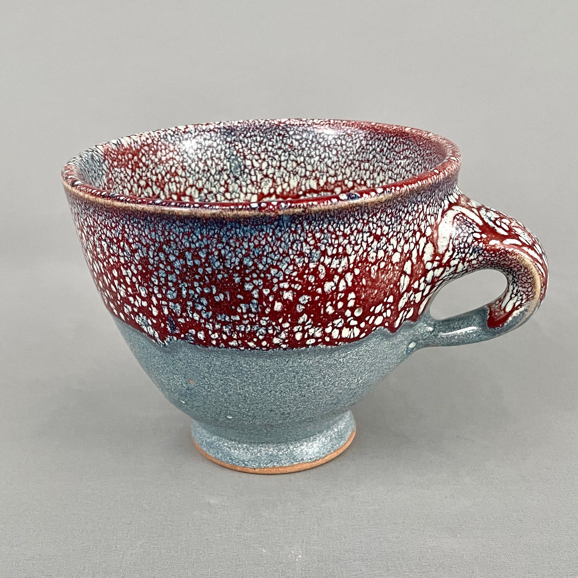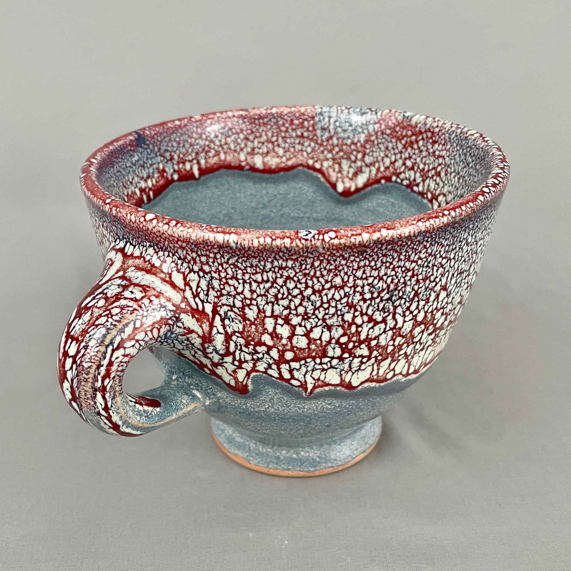 Feeling very "Venti latte" with this functional one-handled bowl. Dappled colors of reds, blues, and cream. This glaze combination is uniquely different and beautiful every kiln firing. The bowl design is fabulous for handling big coffees, hot soups, chili, etc due to the shape and ergonomic handle. Extra elegance with the small pedestal foot. Food safe. Microwave safe. Dishwasher safe (although handwashing will extend the life). Handmade by John Foelber. Signed on bottom with his makers mark JF.