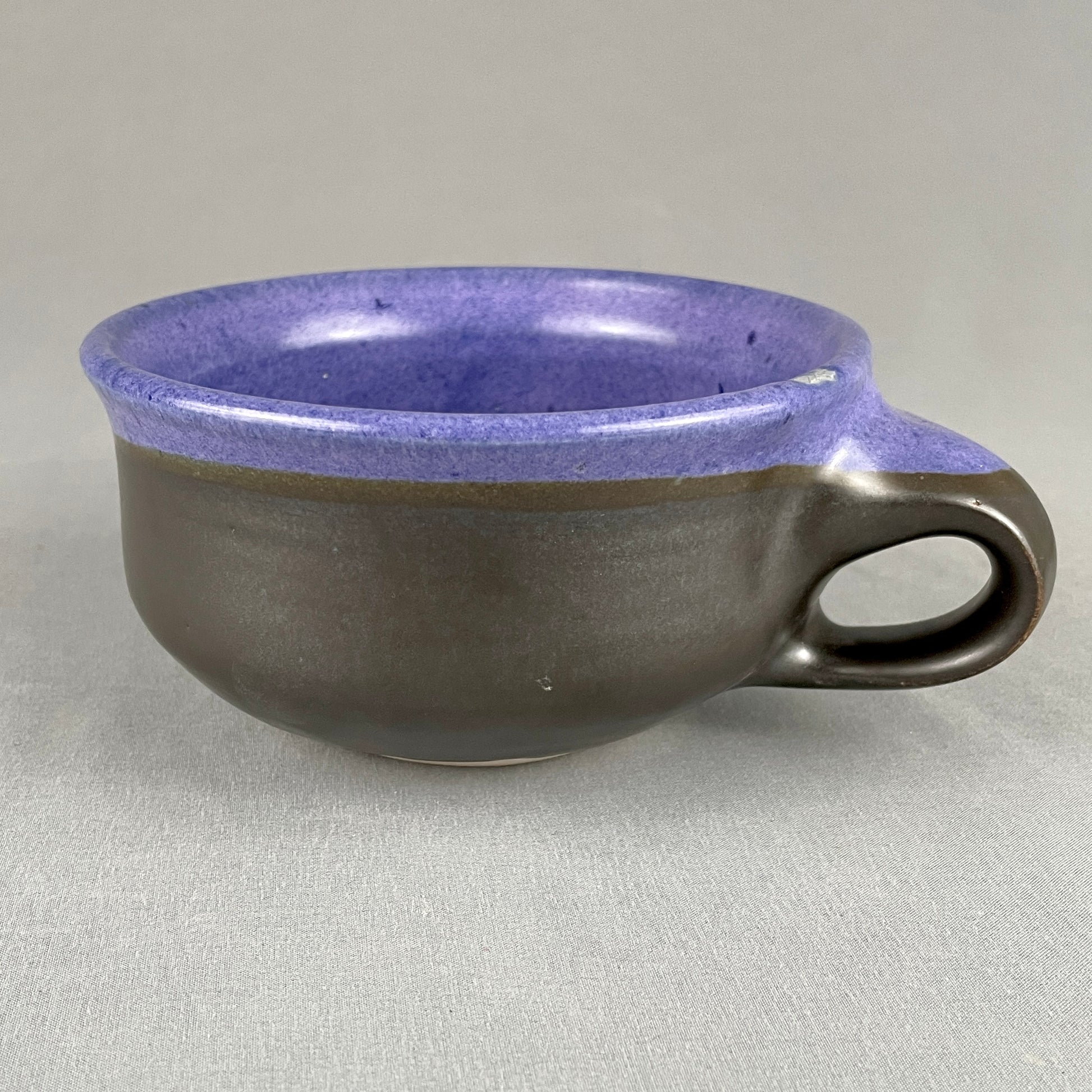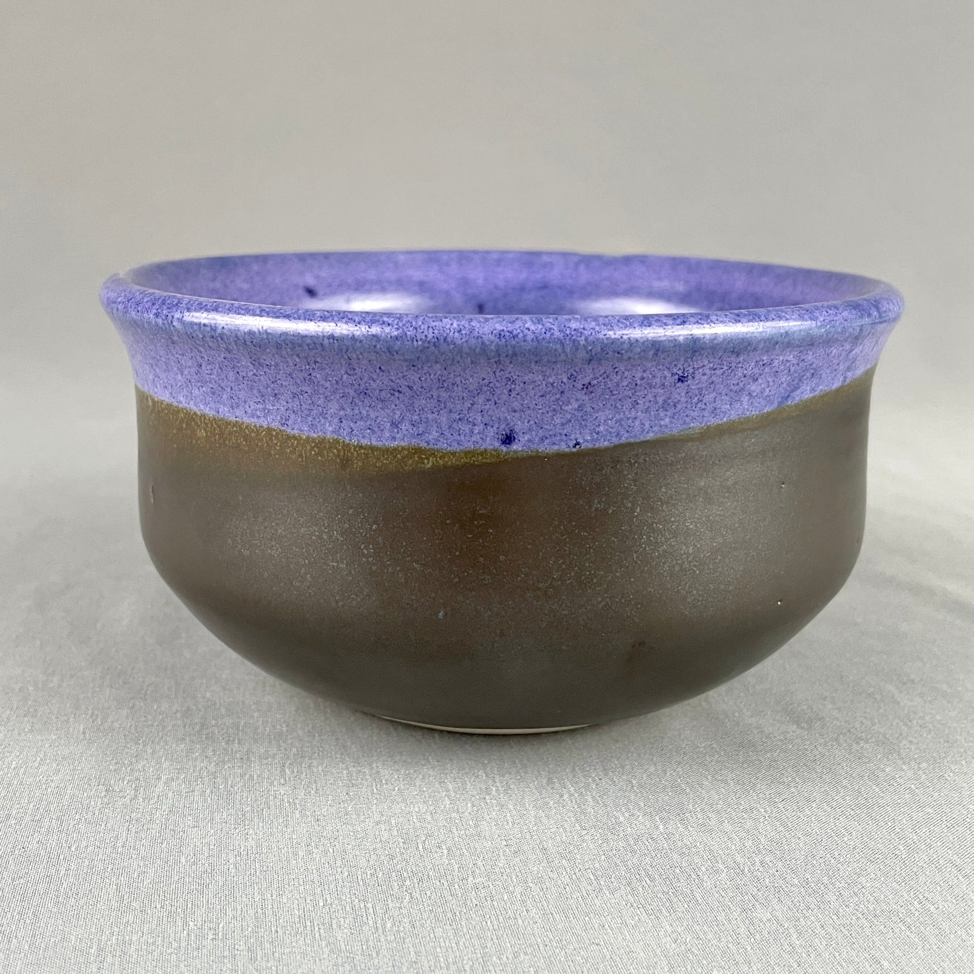 Satin blue-violet interior and rim. Soft, satin black exterior. Stoneware clay. Food safe. Microwave safe. Dishwasher safe although handwashing is recommended. Created by John Foelber. Holds 16oz. 3"h x 6.5"w.
