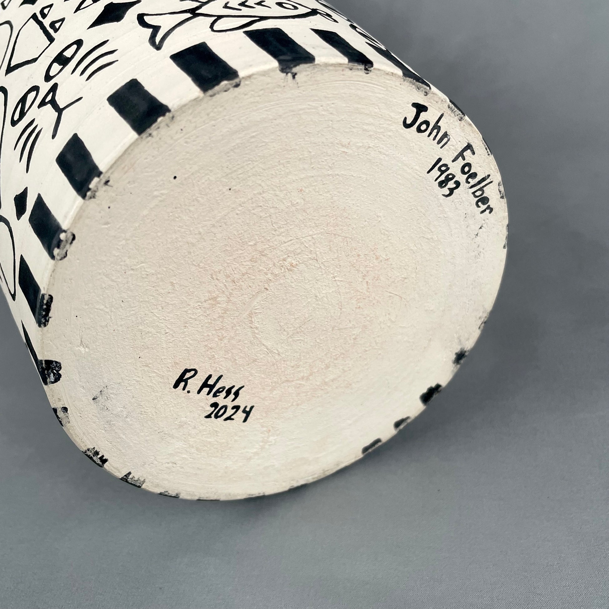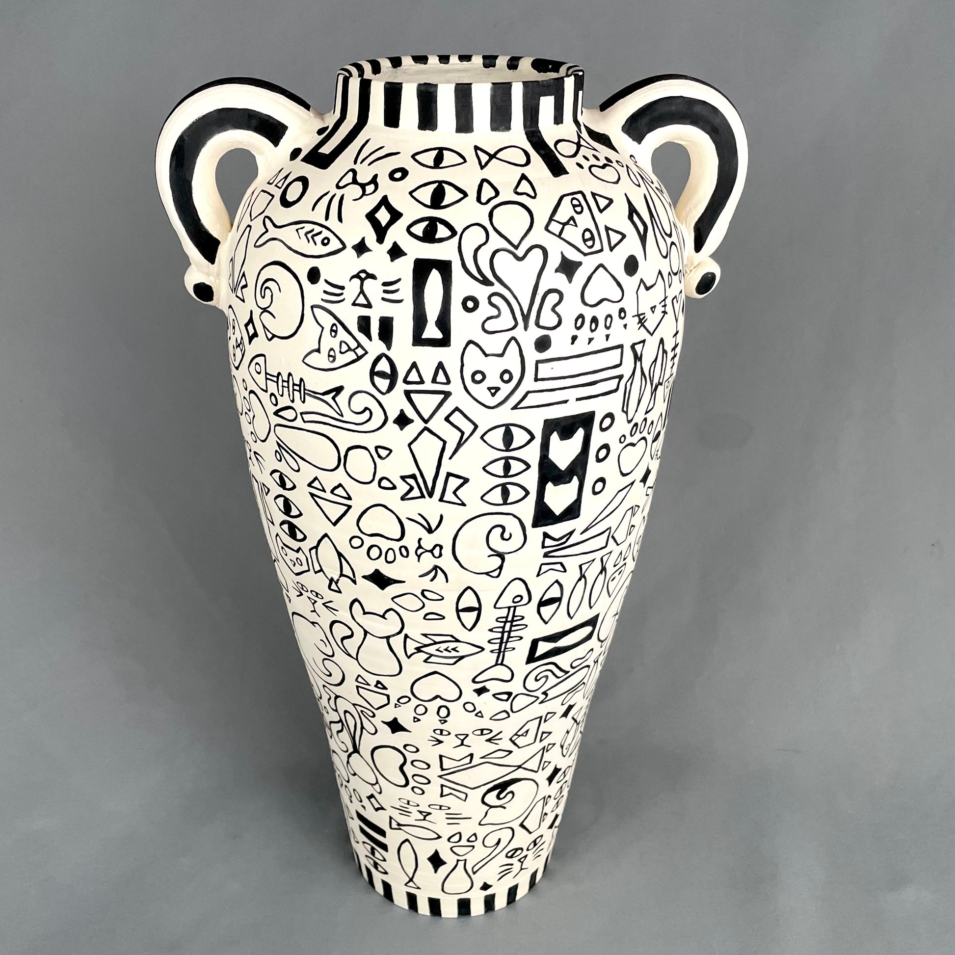 Stunning classically shaped, white vase. Contemporary twist by incorporating two thick rounded handles with ball embellishments. Incredible cat-hieroglyph design over the entire surface. So many unique drawings and details! A collaboration between master potter, John Foelber, who created the form in 1983 and painter/illustrator, Rachel Hess, who created the graphics in 2024. Note the signatures of both on the base. Kiln fired to 1870F. Unglazed surface is sealed for protection. Not watertight.