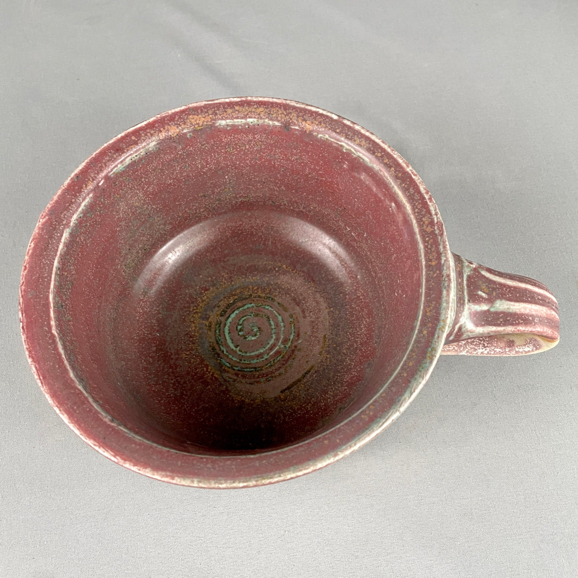 Rich, mulberry interior with hints of green. Exterior has mulberry drips with a base of creams, cherry, whites, and greens. Stoneware clay. Food safe. Microwave safe. Dishwasher safe although handwashing is recommended. Created by John Foelber. Holds 20oz. 4"h x 5.5"w.