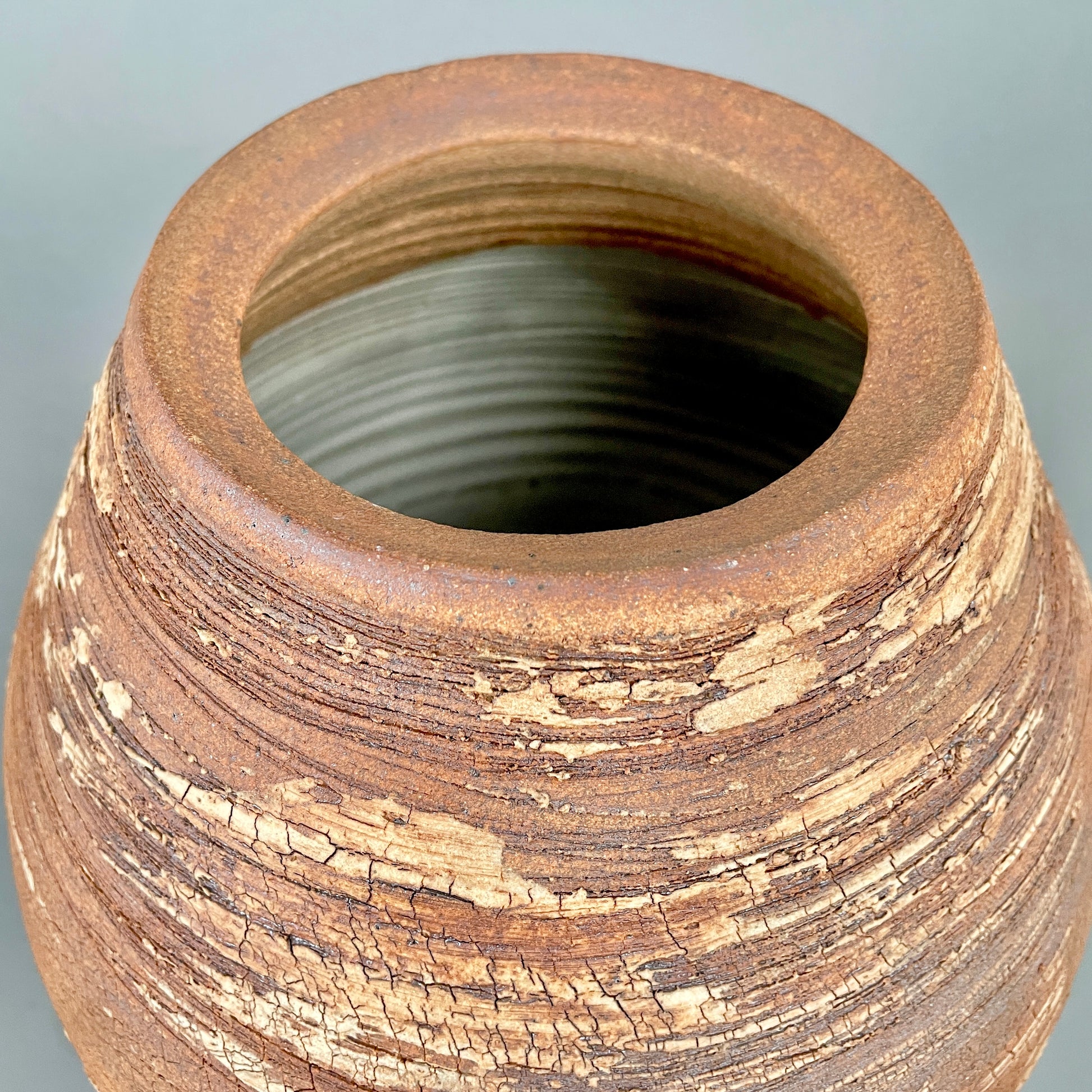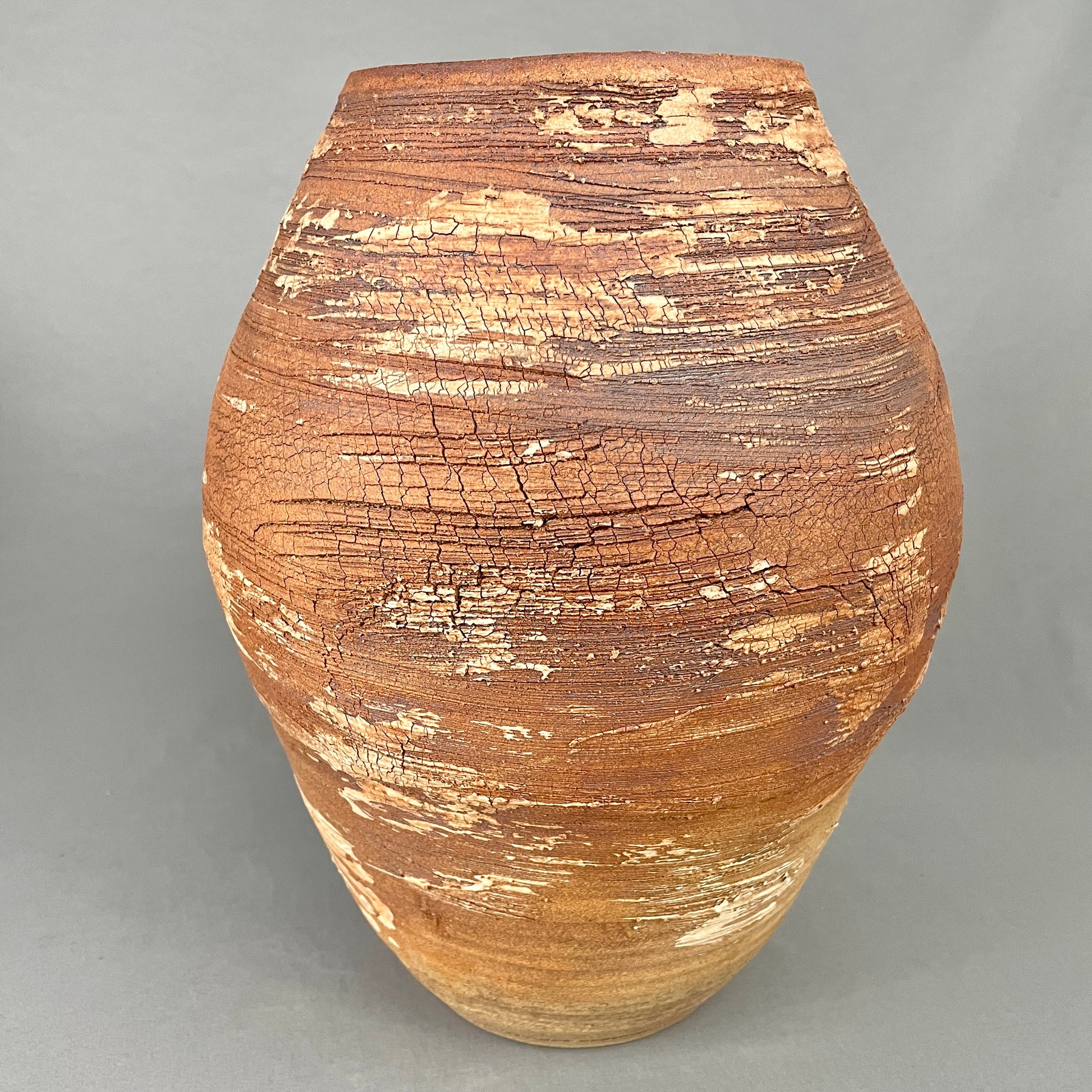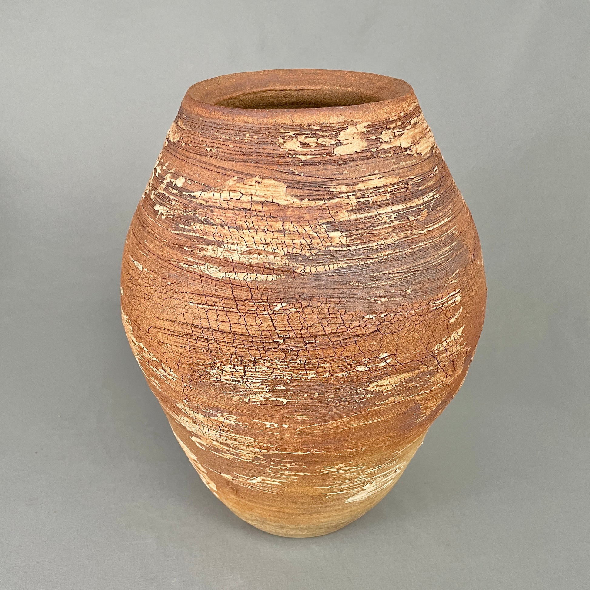 Stoneware vessel with exterior of raw, unglazed, textured clay. Note the surface detail of crackled, scraped, neutral colors. Rugged yet beautiful, just like nature. Inside is glazed with mottled, speckled satin white/cream. Watertight. 12”h x 9”w. Opening is 4”. Handmade by John Foelber