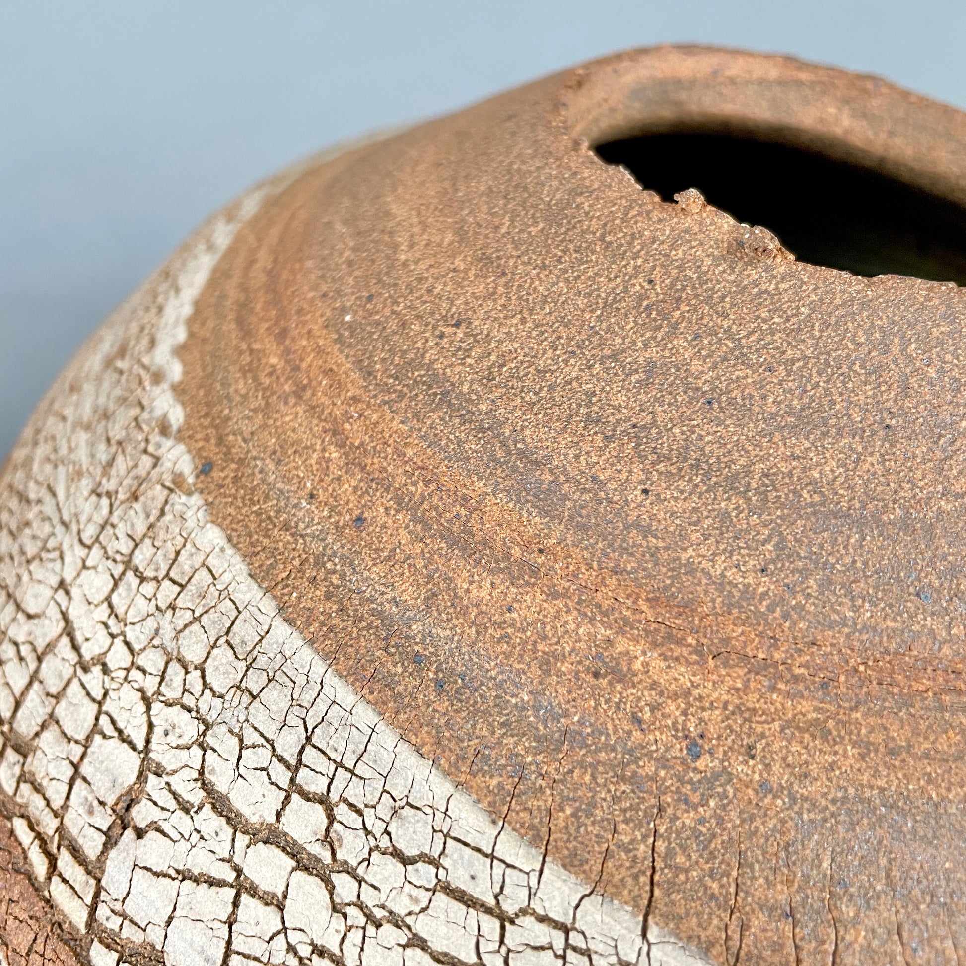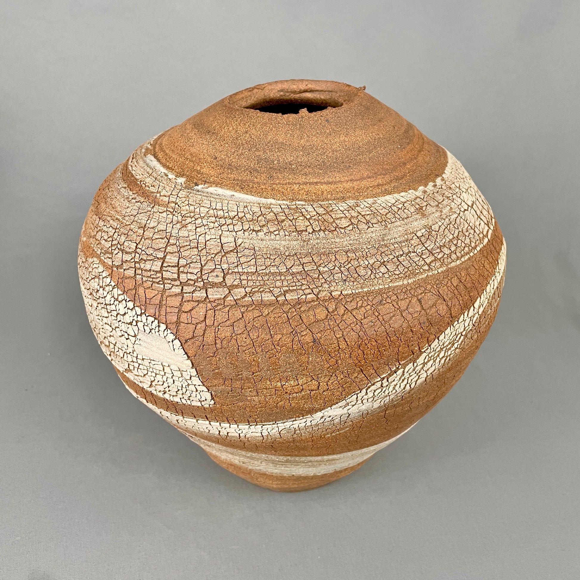 Stoneware vessel with exterior of raw, unglazed, textured clay. Graceful, bulbous silhouette and naturally ragged rim. Rugged yet beautiful, just like nature. Note the surface detail of crackled, striated, neutral colors. Inside is glazed with mottled, speckled satin white/cream. Watertight. 10”h x 10”w. Opening is 2.5”. Handmade by John Foelber
