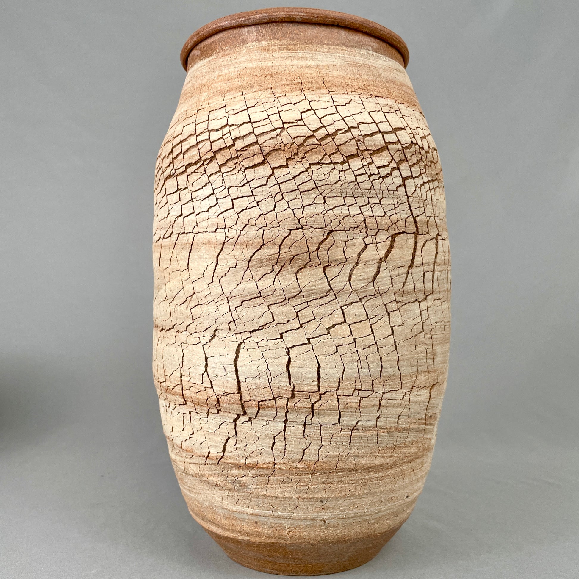 Stoneware vessel with exterior of raw, unglazed, textured clay. Note the surface detail of crackled, striated, neutral colors. Inside is glazed with mottled, speckled satin white/cream. Watertight. 10”h x 6”w. Opening is 3.5”. Handmade by John Foelber