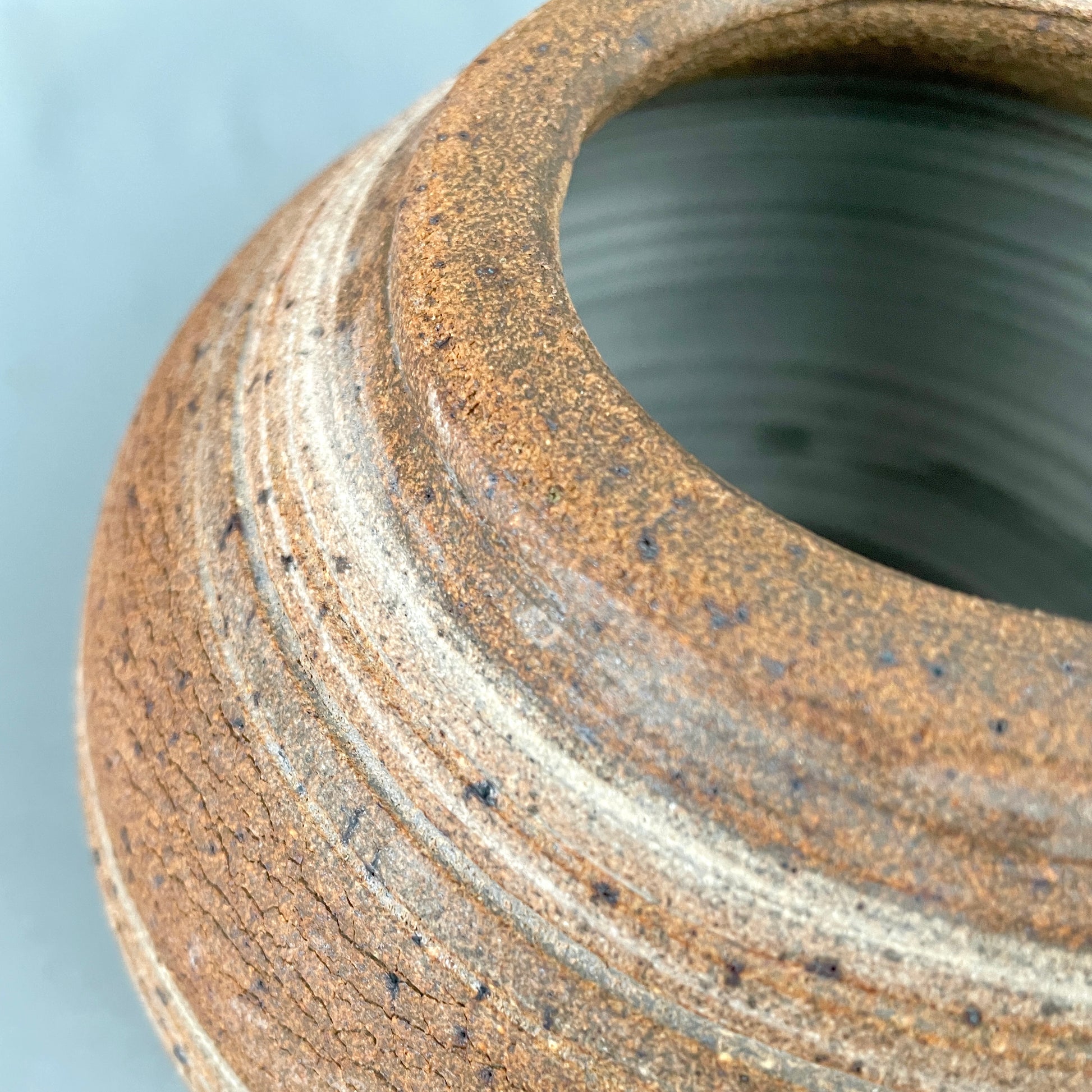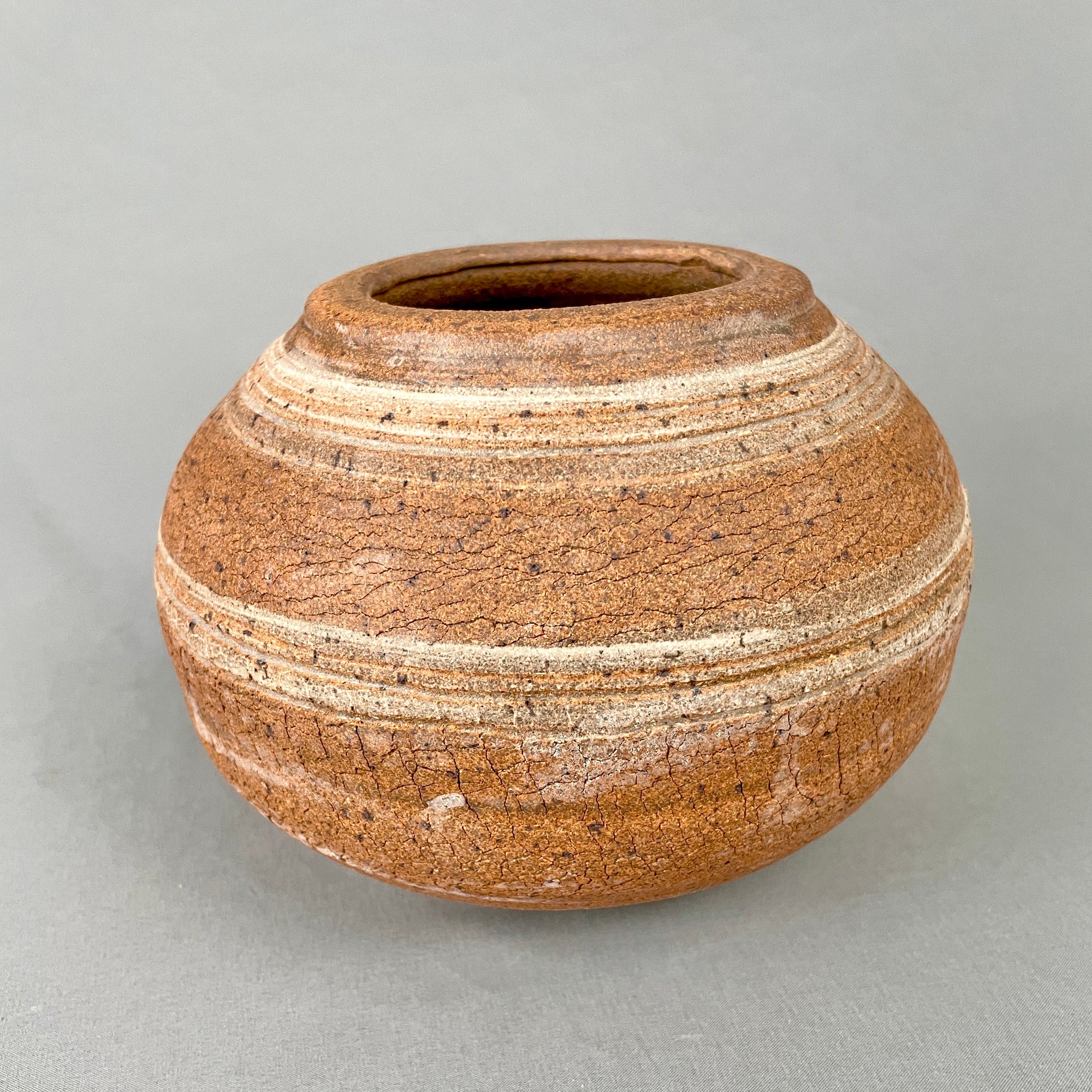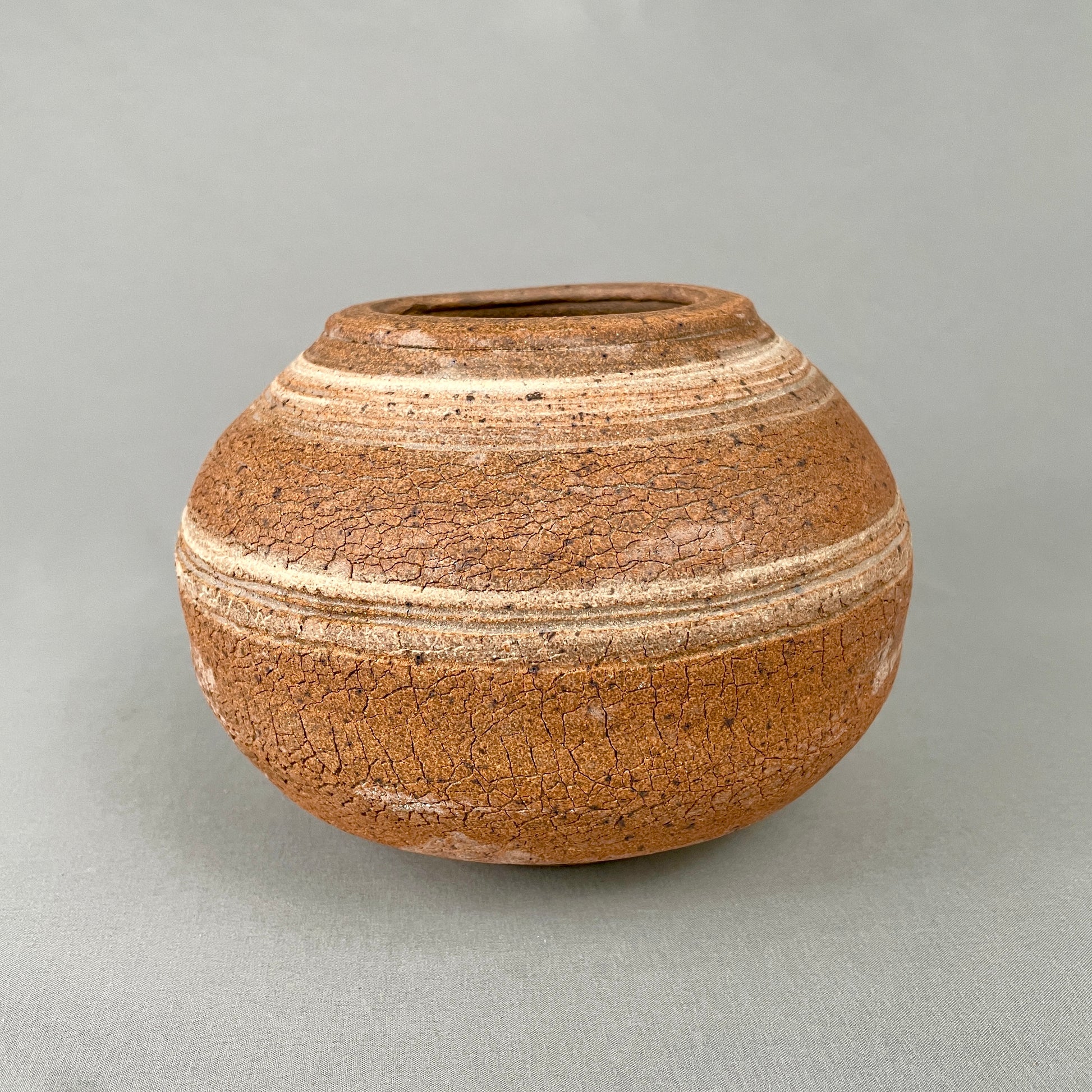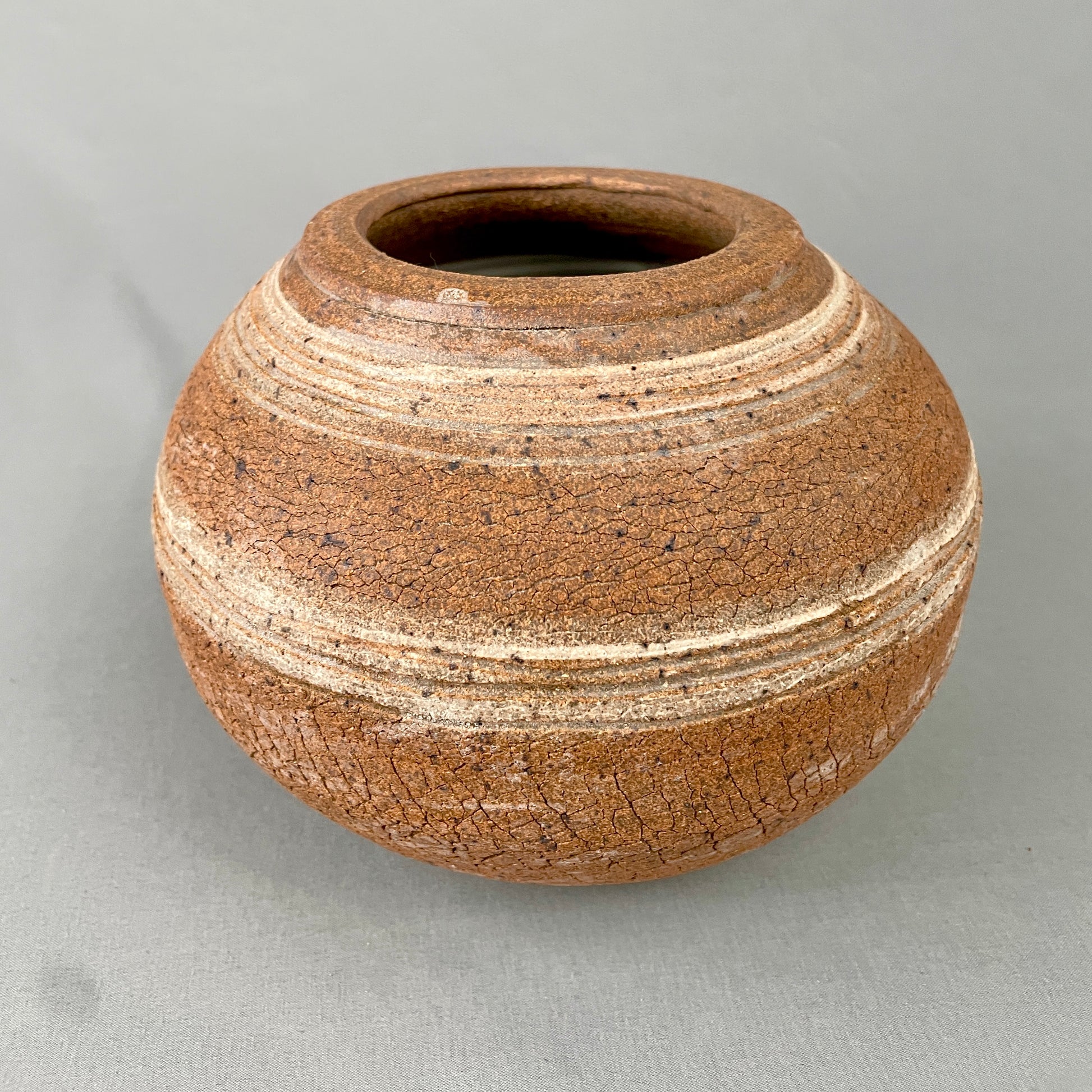 Stoneware vessel with exterior of raw, unglazed, textured clay. Note the surface detail of striated neutral colors. Inside is glazed with mottled, speckled satin white/cream. Watertight. 5”h x 7”w. Opening is 3”. Handmade by John Foelber